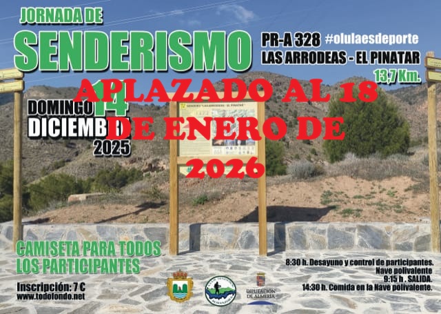 ATENCIÓN!. Os informamos, que debido a las previsiones meteorológicas del próximo fin de semana, se aplaza la actividad de II Jornadas de Senderismo Sendero PR-A 328 La Arrodera - El Pinatar, prevista para el próximo domingo día 14, pasando a ser la nueva fecha el 18 de Enero.